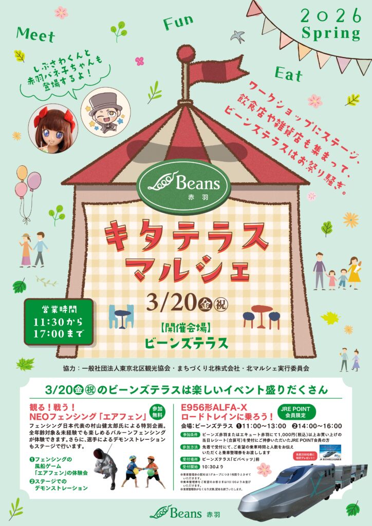3月20日(金・祝) JR赤羽駅高架下のビーンズテラス&赤羽駅東口付近で「キタテラスマルシェ2026 Spring」を開催します!